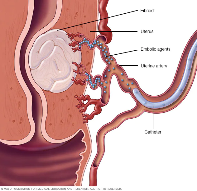 Uterine artery embolization is a minimally invasive procedure that blocks the blood supply to fibroids or adenomyosis areas so they shrink and symptoms improve.
